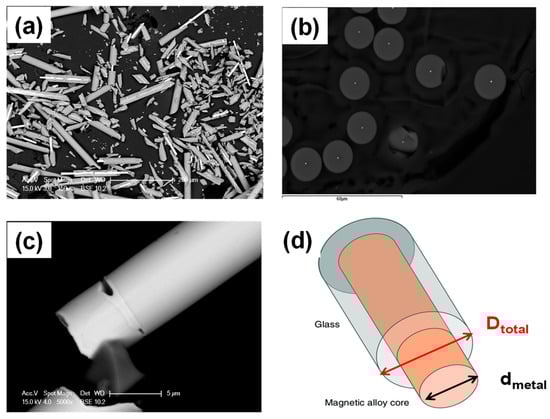 SEM image of Co2MnSi glass-coated microwire (a) and its cross section (b). (c) High magnification of a single glass coated microwire and (d) indicates the formation of Co2MnSi glass-coated microwires, sketch.