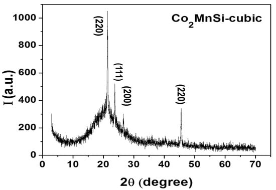 Figure 2 shows the XRD analysis of the as-prepared Co2MnSi glass-coated microwires. A wide halo centered on a 2θ ≈ 20° peak related to the presence of an amorphous phase is combined with a narrow peak at the same angle related to the ordered L21 cubic phase with (220). The main source of the amorphous phase is the rapid melt quenching associated with the Taylor–Ulitovsky fabrication method []. In addition, a very narrow peak at 2θ ≈ 45.6° is detected that corresponds to the highly ordered L21 cubic structure (space group: Fm-3m). In addition, other peaks with (111) and (200) for 2θ ≈ 24° and 2θ ≈ 27°, respectively, are related to the disordered B2 structure.