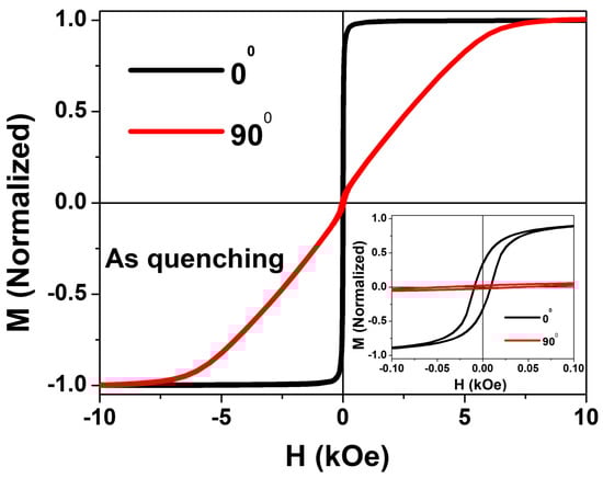 The hysteresis (M-H) loops of as-prepared Co2MnSi glass-coated microwire measured at room temperature for two different applied external magnetic field directions to check the magnetic anisotropy are shown in Figure 3. First, the direction where the external magnetic field is applied is parallel to the axis of the Co2MnSi glass-coated microwire, i.e., θ = 0° (in plane) and the other direction is perpendicular to the axis of the Co2MnSi glass-coated microwire, i.e., θ = 90° (out of plane). As expected, the sample exhibited ferromagnetic behavior as the transition to the paramagnetic phase for the Co2MnSi alloy is above room temperature (Tc = 985 K) []. For easy comparison, all hysteresis loops are normalized to the maximum magnetic moment. As observed in Figure 3, the Co2MnSi glass-coated microwire shows strong axial magnetic anisotropy where the axial hysteresis loop shows a squared shape with high magnetic remanence magnetization, whereas the out-of-axis hysteresis loop shows a liner shape with a remanence magnetization near to zero (see the inset of Figure 3). Thus, the easy magnetization direction is parallel to the microwire axis, and the hard magnetization direction is in the perpendicular direction. The behavior of both the axial and the out-of-axis hysteresis loops indicates the existence of magnetic anisotropy.