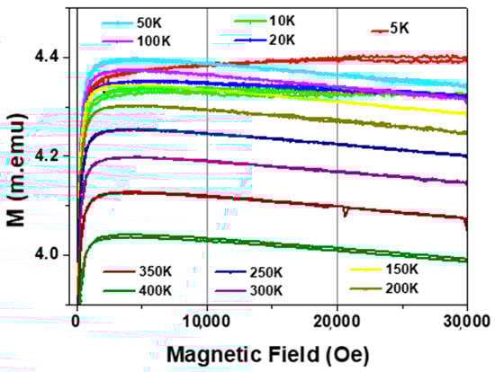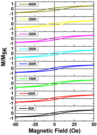 In Figure 4, we focus on the part of the hysteresis loops that illustrates the increase of the saturation field for all samples with temperature. The saturation magnetic field, Hsat, shows unusual behavior with temperature and magnetic field. A monotonic increase in the saturation magnetic field by decreasing the temperature from 400 K to 50 K is observed. Then, Hsat, begins to decrease upon decreasing the temperature from 50 K to 10 K. Finally, an additional Hsat increase by decreasing the temperature from 10 K to 5 K is observed. The maximum saturation magnetic field is observed at T = 50 K for the magnetic field (H) range 0 ≤ H ≥ 10,000 Oe. The variation of saturation field with temperature can be attributed to the change in the magnetic microstructure of Co2MnSi by decreasing the temperature. In addition, the changing of the internal stresses originated by the glass cover layer with temperature leads to modification of the microstructure of the sample, which directly affects the magnetic response. Furthermore, the antiferromagnetic coupling of Mn-Mn, which appears for the temperatures below the room temperature, adds an additional effect in changing the magnetic behavior of the Co2MnSi with temperature. On the other hand, the diamagnetic contribution of the glass-coating can affect the hysteresis loops character providing a negative slope on M–H loops above the saturation.