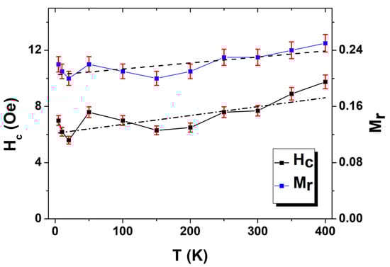 Figure 5 illustrates the hysteresis loops of Co2MnSi glass-coated microwires measured in the temperature range from 400 to 50 K. All measured hysteresis loops do not show a notable magnetic change, where the average values of the coercivity and normalized magnetic remanence do not show a strong change with temperature (see Figure 6). The difference between the highest value and the lowest value of the coercivity and the normalized remanence is 5 Oe and 0.08, respectively. This observation is different from the one that we reported for Co2FeSi glass-coated microwires, in which we observed a strong dependence of the coercivity and remanence on temperature, as reported in Ref. []. We illustrated that the competition between different kinds of magnetic anisotropy, i.e., the uniaxial magnetic anisotropy, cubic magnetocrystalline anisotropy and their temperature dependence led to the anomalous magnetic behavior of the coercivity and remanence with temperature. In the current case, we suppose a weak dependence for both types of the magnetic anisotropy on the temperature. Thus, roughly a stable magnetic behavior with temperature is observed.
