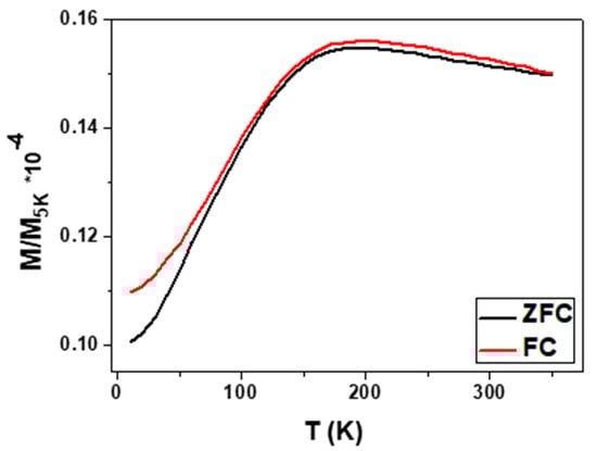 It is important to evaluate the complete magnetic behavior with temperature in order to check its thermal stability, which it is an important physical property to determine its potential for spintronics application. In addition, the temperature dependence can provide useful information on the possibility for the magnetic phase transition. Thus, we measured the magnetization dependence on temperature (M vs. T), i.e., zero field cooling, (ZFC) and field cooling (FC), at low magnetic field (H = 100 Oe) and temperature range from 5 to 350 K, as plotted in Figure 7. In the field cooling protocol, the as-prepared Co2MnSi glass-coated microwires were cooled down to 5 K under an applied magnetic field (H = 100 Oe), which caused the random magnetic moment vectors to freeze parallel to the applied field at low temperatures. However, the M-H loops show a thermal magnetic stability (M vs. T) for both ZFC and FC magnetization curves that show strong irreversibility magnetic behavior with a blocking temperature at 150 K. Such magnetic irreversibility has been detected in Co2-based Heusler alloy glass-coated microwires []. This irreversibility strongly depends on the micromagnetic structure of the magnetic materials. In addition, it appears to be owing to the coexistence of typical re-entrant ferromagnetism and spin glass-type behavior, as reported elsewhere []. Moreover, the disordered structure (B2 phase) and chemical composition of the Co2MnSi glass-coated microwires affects the irreversibility behavior where the magnetic ground state is not purely ferromagnetic but has a strong antiferromagnetic contribution, especially at low temperature for Mn-Mn interaction; random spin disorder (B2 phase) is also found with the ferromagnetic order (L21 phase) [,].