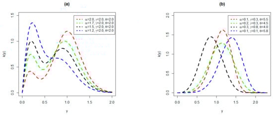 Different plots of the PDF of the NMEPA-Wei distribution are presented in Figure 1a,b for different values of the parameters and . From Figure 1a,b, we can see different PDF patterns including bio-modal, left-skewed, right-skewed, and symmetrical curves.