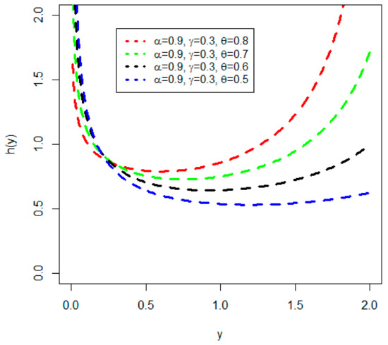 Here, different plots of the HF of the NMEP-Wei distribution are presented in Figure 2a,b. From Figure 2a, we can see increasing and decreasing HF , while in Figure 2b, we can see uni-modal HF . Similarly, from Figure 3, we can see bathtub HF of the NMEPA-Wei distribution.