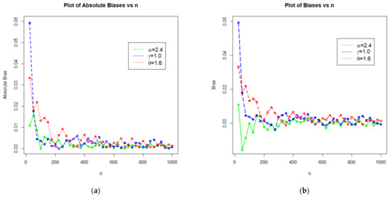 Plots of (a) absolute biases vs. n, and (b) biases vs. for Set 1: 1.4, 1.0, 1.6.