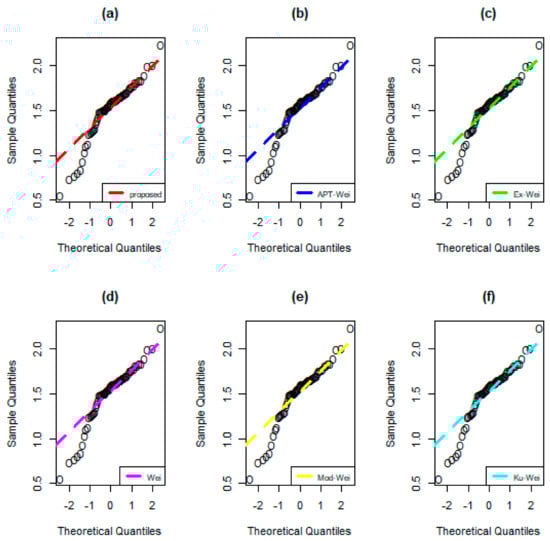 Q-Q (quantile–quantile) plots of (a) NMEPA-Wei, (b) APT-Wei, (c) Ex-Wei, (d) Wei, (e) Mod-Wei, and (f) Ku-Wei distributions for Data 2.