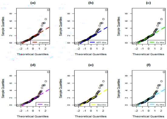 Q-Q (quantile–quantile) plots of (a) NMEPA-Wei, (b) APT-Wei, (c) Ex-Wei, (d) Wei, (e) Mod-Wei, and (f) Ku-Wei distributions for Data 1.