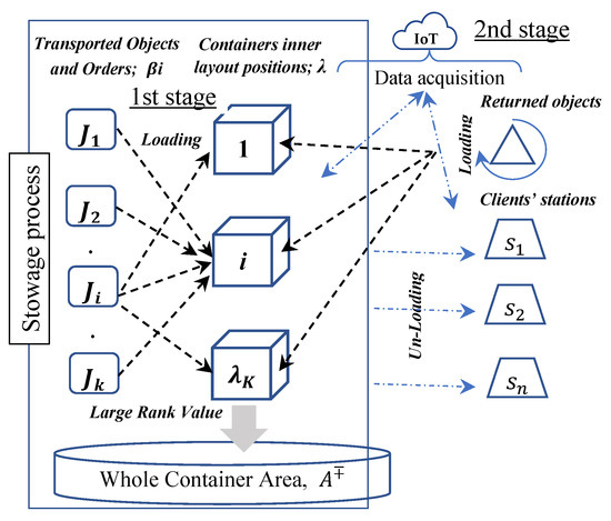 The logistic party focuses on distribution activities, planning, execution, handling/communication, storage, and delivery efficiency. One of the challenges of logistics is the stowage of objects in as little space as possible at the warehouse and/or vehicle container (β), forcing us to predict accurately consuming products (β′) areas [2]. The e-commerce system has data characterized by rapid change and bigness. Therefore, the methodology recommends IoT manage this system online after digitizing e-commerce activities and all transported objects and the distribution points (i.e., stations) [3,4]. The IoT is nominated to verify and track the container’s objects during loading and unloading until the delivery destination and substitute that every delivered item is offset by a new one requested from the supplier or previous point on the distribution chain [5]. This article addresses many objectives for the proposed methodology, which have been discussed in the stowage problem. The most important of them is to ingest the total stowage transported boxes (i.e., objects) to reduce their cost. They are then reducing the partial delivery time, particularly for objects with time-sensitive freight delivery and in emergency crises when prompt delivery is critical. Additionally, it receives the returned objects during the distribution chain easily [6]. The proposed methodology consists of overlapping steps. The preliminary steps are based on the heuristic technique that helps obtain a semi-optimal solution for ranked objects at a temporary stowage map, while the late steps tackle numerically for enhancing the picked solution from the afore phase and dividing them into the group with the same guillotine boundary [2,6], then trying to replace and switch places between them to ingest all available transported objects. The underlying theory of e-commerce is that the data on all transactions within the warehouse or logistics stock system are digitally tracked through a unified and efficient structure. The IoT provides proactive data during distribution trips to calculate the best utilization for the space caused by unloading objects to be ready for (re)stowing by returned ones, as shown in (Figure 2).