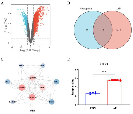 Discrimination of necroptosis−related DEGs in AP. (A) Volcano plot of DEGs among GSE109227 datasets; (B) Venn diagram of AP and necroptosis; (C) Protein−protein interaction network; (D) Relative expression of RIPK1 in control samples and AP samples. Red nodes in A are up−regulated genes; blue nodes in A are down−regulated genes; ***, p < 0.001; red nodes in D are the AP group sample; blue nodes in D are the CON group sample.