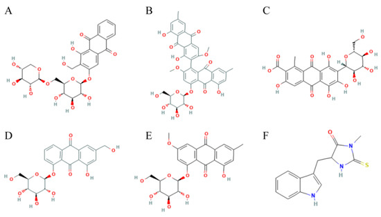 Structures of anthraquinone selected from virtual screening. (A) Lucidin Primeveroside; (B) Aloe-Emodin-8-O-Beta-D-Glucopyranoside; (C) Torososide A; (D) Rheochrysin; (E) Carminic acid; (F) Necrostatin-1.