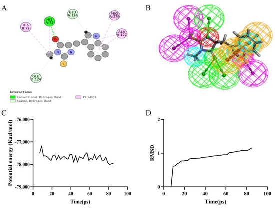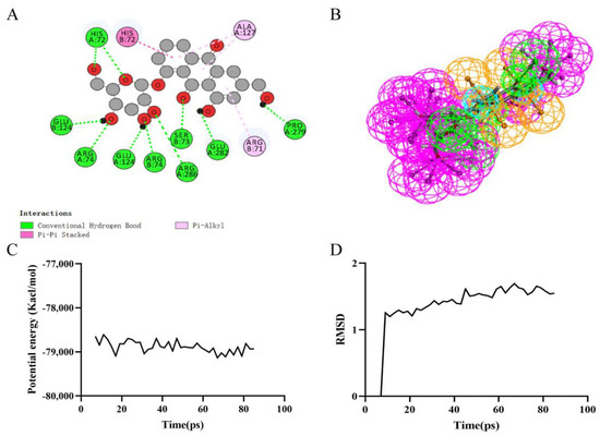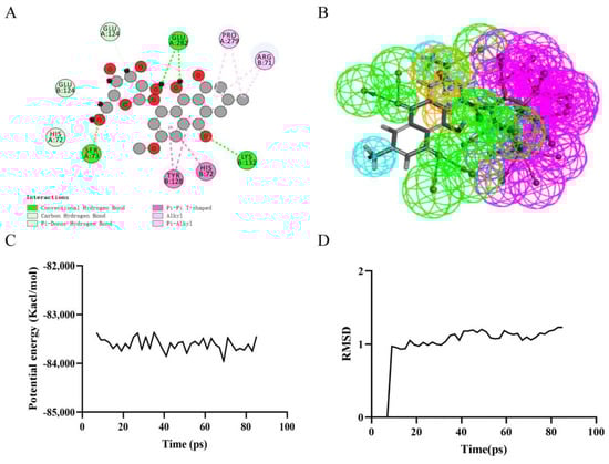 Ligand binding analysis, pharmacophore analysis and molecular dynamics simulation of Rheochrysin. (A) 2D diagram of inter−molecular interaction of Rheochrysin with RIPK1; (B) Pharmacophore predictions; green represents hydrogen acceptor; blue represents the hydrophobic center; purple represents hydrogen donor; yellow represents aromatic ring by Schrodinger. (C) Potential Energy; (D) Average backbone RMSD.