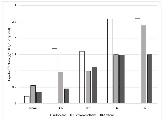 The 6 h acetone extraction shows the lowest proportion of extracted lipid compounds as estimated by their peak area proportion in the total chromatogram (15.3 mg/g of dry leaves, corresponding to 43% of the total extract), while the non-polar or weak polar solvents n-hexane and dichloromethane extracted a similar lipid proportion estimated as 26.1 and 24.1 mg/g of dry leaves, corresponding to 77% and 86% of the total extract, respectively (Figure 1). The lipid proportion in the extracts increased with the extraction time, e.g., from 1.7% to 2.6% with n-hexane, and from 0.5% to 1.5% with acetone for 1 h and 6 h extractions, respectively.