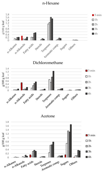 The recovery (in g/100 g leaves) of the extracted cuticular lipids by the chemical family under the different conditions is shown in Figure 2. The difference in the acetone extract in comparison with the hexane and dichloromethane extracts is clear with the major extract fraction being sugars representing 1.67 g/100 g leaves (6 h extraction). Hexane and dichloromethane permit the recovery of cuticular terpenes (1.51 and 1.24 g/100 g leaves, respectively) and fatty acids (0.55 and 0.55 g/100 g leaves, respectively).
