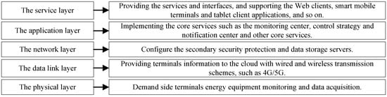 The five-layer framework of information interconnection is shown in Figure 2, including the physical layer, data link layer, network layer, application layer and service layer, explained as follows.