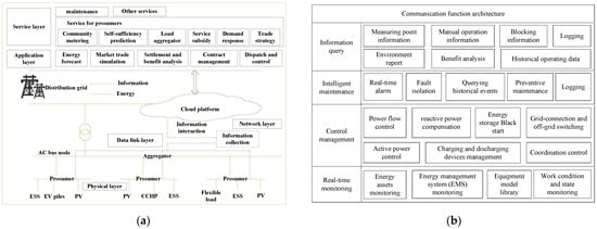 The architecture figure. (a) Information interaction and prosumers’ structure; (b) Communication function architecture.