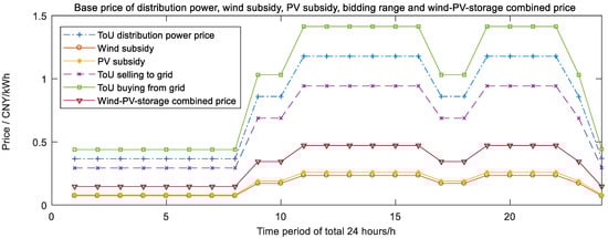 According to the basic peak-flat-valley electricity price of power grid company, the 24 h of a day are divided into four main bidding segments, namely the valley load time period (24:00 pm–7:00 am), flat-peak-flat period (8:00 am–11:00 am), flat-peak-flat period (12:00 am–17:00 pm), and flat-valley period (18:00 pm–23:00 pm). The ToU selling to grid and ToU buying from grid constrain the bidding price within a certain range.
