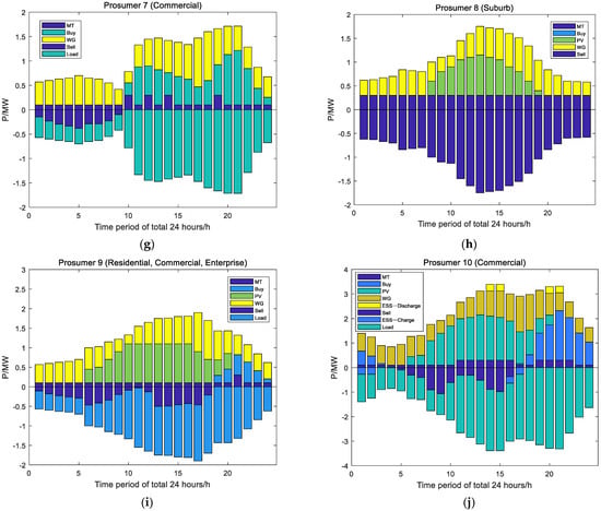 The optimization operation scenarios of 10 prosumers. (a) Prosumer 1; (b) Prosumer 2; (c) Prosumer 3; (d) Prosumer 4; (e) Prosumer 5; (f) Prosumer 6; (g) Prosumer 7; (h) Prosumer 8; (i) Prosumer 9; (j) Prosumer 10.