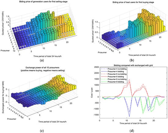 The bidding scenario for the first stage of P2P distributed trading. (a) Generation users; (b) Load users; (c) Exchanged power after first matching; (d) Bidding costs compared with exchanged with grid about prosumer 4, 6 and 8.