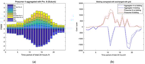 The bidding scenario for the first stage on the aggregator scenario. (a) Aggregator 4’ s optimization solution; (b) Bidding compared with no bidding of user 4 and 6.