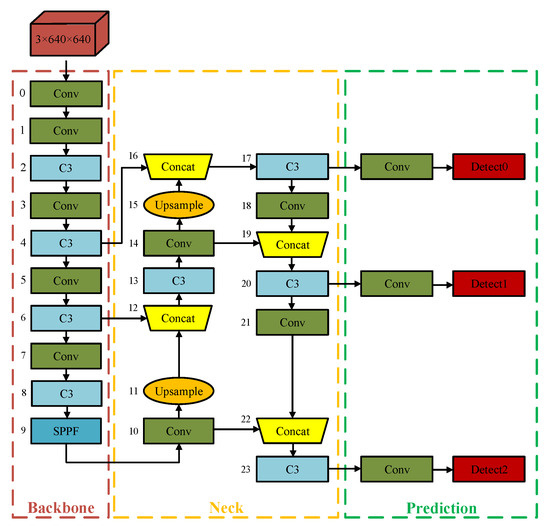 The YOLO series is a single-stage target detection method, which consists of the input, the backbone network, the neck, and the output. Mosaic data enhancement and adaptive anchor frame are approved at the input end in YOLOV5, thus it is good at highlighting small target features. In the backbone network, C3 is used to avoid gradient disappearance. A hybrid FPN + PAN is used to enhance the fusion of the shallow feature information. The binary cross-entropy loss is used for the classification loss in the training, and it is defined as follows: