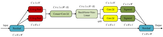 Coordinate attention (CA) is a network architecture proposed by Hou et al. [42]. Because the location information is embedded into channels, the cross-channel feature information can be easily extracted, thus the target regions can be accurately located and identified. The architecture of the coordinate attention is shown in Figure 2.