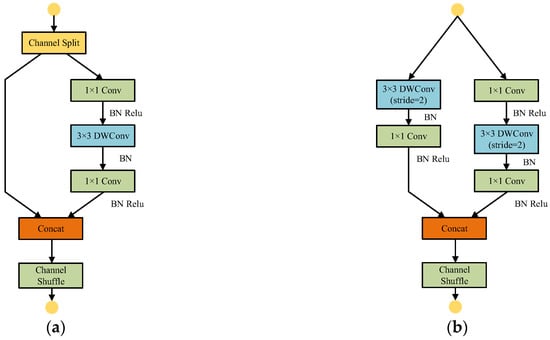 The architecture of ShuffleNetV2: (a) Basic module; (b) Down-sampling module.