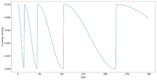 where ηt denotes the current learning rate, ηmax and ηmin signify the maximum and minimum learning rates, respectively. Tcur is the epoch number executed since the last restart, and Ti signifies the epoch number that needs to be trained after ith restart. The change curve of the learning rate under the action of the algorithm is shown in Figure 4.