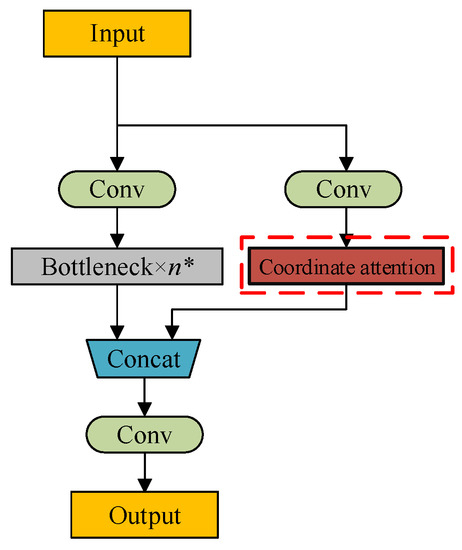 The shallow architecture of YOLOV5 leads to low accuracy and efficiency, thus the coordinate attention is introduced into the C3 module, and a new module CA-C3 can be obtained. The new module CA-C3 is shown in Figure 5. One part consists of a convolution layer and a number of Bottleneck modules, which reduces the parameter amount of Bottleneck modules. The other part consists of a convolutional layer and coordinates attention to enhance the feature extraction ability. Finally, concat operation is performed on the two parts to obtain the CA-C3 module. The main advantage of this module is to reduce the loss of feature information.