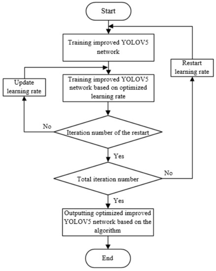 In order to obtain good performance, the cosine annealing with warm restarts algorithm is applied to optimize the above-improved YOLOV5, thus YOLOV5 can be further improved. The optimization flowchart is shown in Figure 7.