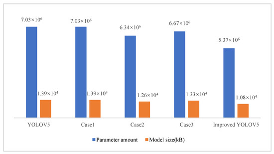 We can see from Figure 10 that the parameter amount and model size is not influenced by the cosine annealing with warm restarts algorithm by comparing YOLOV5 and Case 1. Based on Case 1 and Case 2, the parameter amount can be reduced by the CA-C3 module. In Case 3, since Line I and Line II are connected to other modules, the parameter amount and model size are all increased compared with Case 2. In order to eliminate the adverse effects of Case 3 on the parameter amount and model size, the introduction of the lightweight method ShuffleNetV2 has greatly reduced the parameter amount and model size, and the parameter amount and model size of improved YOLOV5 is the least, and they are even 23.48% and 22.3% lower than those of YOLOV5 respectively.