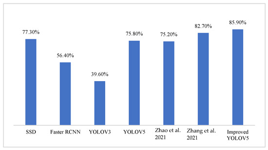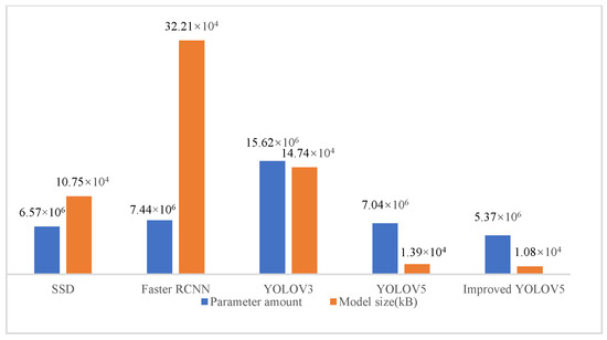 To further verify the effectiveness and superiority of improved YOLOV5, it is compared with other models single shot multi-box detector (SSD), faster RCNN, YOLOV3 and the methods proposed in [45,46]. Their mAP are displayed in Figure 12, and their parameter amount and model size are shown in Figure 13.