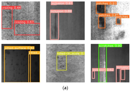 The dataset of NEU-DET [44] is used to verify the effectiveness and superiority of improved YOLOV5. In the dataset, each defect type has 300 images, a total of 1800 images. There are six defect types: crazing, inclusion, patches, pitted_surface, roll-in_scale, and scratches. The crazing defect is mainly featured by irregular lines. The inclusion defect is of different shapes. The patches defect is of irregular shapes. The pitted-surface defect is generally characterized by local pits. The rolled-in scale defect is manifested as convexes in many places. The scratches defect is mainly shown as long strips. These defects have the characteristics of complex shapes and small sizes. Therefore, their detection difficulty is increased. Figure 9 shows the images of defect samples.