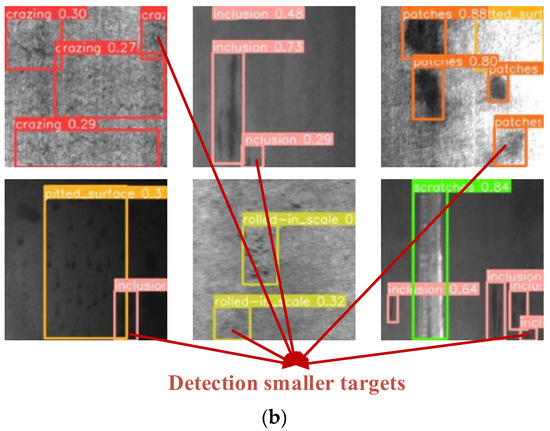 Small targets detected by improved YOLOV5 in Figure 14b are marked with arrows, but the targets are not detected by YOLOV5 in Figure 14a. As can be seen from Figure 14a, although most of the defect targets can be detected by YOLOV5, there are still some small defect targets that are difficult to detect, because the feature loss of convolution operation results in low accuracy. However, all of the above small defect targets can be detected by the improved YOLOV5 with high accuracy.