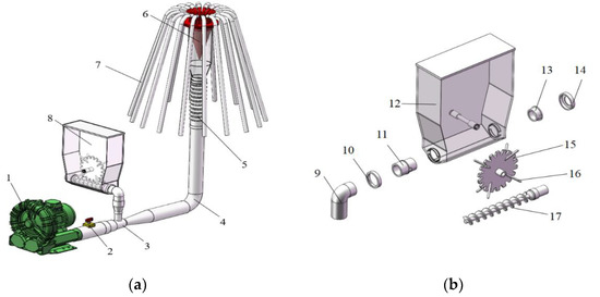 Alfalfa Pneumatic Collector: (a) General Assembly Diagram, and (b) Disassembly Diagram 1. Fan. 2. Air valve. 3. Venturi ejector. 4. Conveying elbow. 5. Bellows. 6. Conical distribution head. 7. Seed guide. 8. Horizontal screw conveyor. 9. Seed drop. 10. Front screw cap. 11. Front end stop. 12. Seed box. 13. End stop. 14. End screw cap. 15. Seed stirring wheel. 16. Seed stirring rod. 17. Auger.