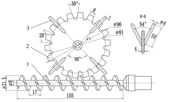 It can be seen from Formula (4) that under the condition of a certain rotational speed, the size of the screw pitch has a significant influence on the axial conveying speed and conveying effect of the particles. According to the working efficiency requirements of the seeder, the outer diameter of the screw auger is initially set to be 21.5 mm, and the pitch is generally taken as 0.8~1.0 [17] for a standard horizontal screw conveyor, so the design pitch is 17 mm. The diameter of the screw shaft is related to factors such as pitch and strength. The calculation formula is , considering the requirements of strength and stiffness, the design diameter of the rotating shaft is 8 mm. Conveying efficiency is among the key performance indicators of screw conveyors, and its calculation formula is: