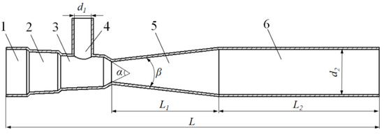 Venturi ejector: 1. Air inlet. 2. Shrinking tube. 3. Throat tube. 4. Feeding tube. 5. Diffusion tube. 6. Mixing tube.