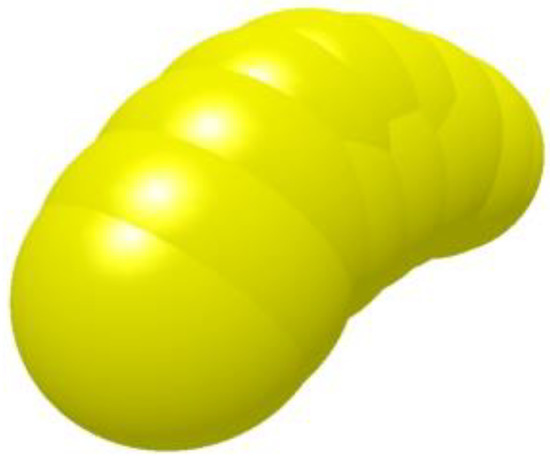 According to the physical properties of alfalfa seeds, a simulation model of alfalfa seeds is established in EDEM software by using the spherical particle combination method. The Hertz–Mindlin non-sliding model is set up for the contact model between particles and the contact model between particles and the parts of the conveyor, as shown in Figure 5. In order to find the optimal contact parameter combination of the discrete element model of alfalfa seeds, the parameters of the alfalfa seed model were calibrated based on the errors of the measured and simulated values of the angle of repose and accumulation angle of alfalfa seeds [21]. The calibrated model parameter combinations are shown in Table 1. The grooved wheel seed metering device was used for experimental verification. The average relative error between the measured and simulated values of the alfalfa seed mass flow rate under the conditions of different seed metering wheel speeds was 2.89%. Therefore, the discrete element model and contact parameters of the alfalfa seeds satisfy the requirements. Discrete element simulation test accuracy requirements. The three-dimensional model of the screw conveyor with a seed stirring mechanism and the three-dimensional model of the screw conveyor without a seed stirring mechanism established by Solidworks software were imported into EDEM software, and the appropriate population of equal height was generated through the particle factory, as shown in Figure 6a,b.