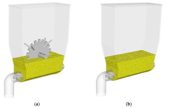 Discrete element model of screw conveyor: (a) conveyor model with a seed stirring mechanism, and (b) conveyor model without a seed stirring mechanism.