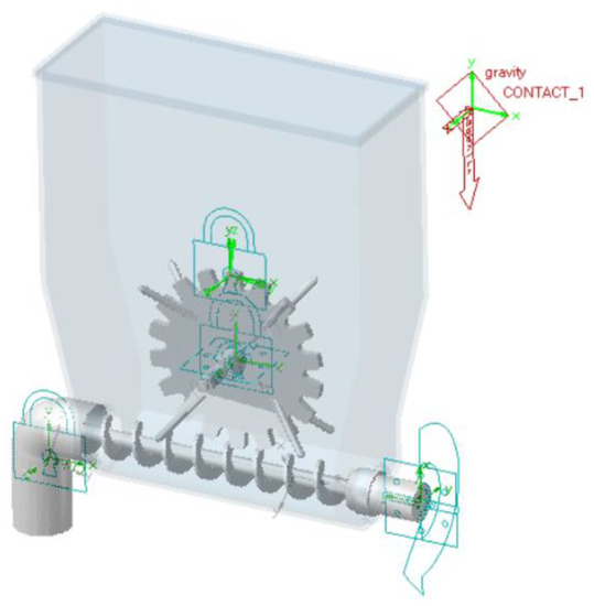 After the 3D model of the screw conveyor is imported into ADAMS software, the material properties of each part are defined, and the relatively static parts form an integral part through Boolean operation, so that only the auger and seed stirring wheel can rotate. In order to better simulate the real environment, the damping value of 100 is added between the auger and the seed stirring wheel. The stirring wheel is driven to rotate by adding a rotary drive to the rotating pair of the auger, and the rotational speed of the rotary drive is set to 180 rpm. In order to make the simulation of the screw conveyor match the actual situation as much as possible, friction force is added to each rotating pair in ADAMS, and the entire model is placed in the same gravity field [23,24]. The virtual prototype model of the horizontal screw conveyor is shown in Figure 7.