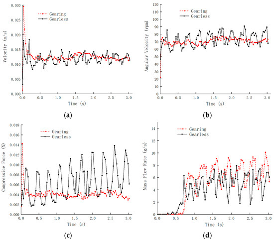 Comparative analysis of seed movement characteristics: (a) variation of population linear velocity with time, (b) variation of population angular velocity with time, (c) variation of the compressive force on the population with time, and (d) variation of the seed mass flow rate with time.