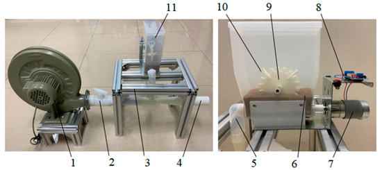 Coupled model validation test bench: 1. Fan. 2. Air valve. 3. Rack. 4. Venturi. 5. Seed drop. 6. Alfalfa seeds. 7. Motor. 8. Controller. 9. Seed stirring wheel. 10. Seed stirring rod. 11. Horizontal screw conveyor.