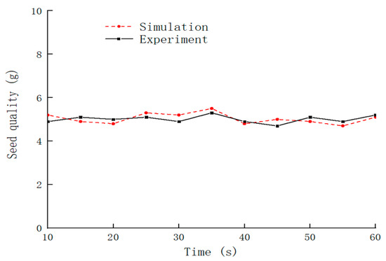 In order to verify the feasibility of the gas–solid coupling model, a pneumatic seed supply test bench was built, its diffusion angle is 5°, the diffuser length is 200 mm, and the length of the mixing pipe is 50 mm, as shown in Figure 11. During the test, the inlet air pressure was set to 3 kpa, and the seed feeding efficiency was 5 g/s. When the wind pressure and seed feeding speed were stable, the number of seed particles collected from the outlet of the Venturi ejector was recorded every 5 s, and the average value was obtained by repeating 3 times each test. The Venturi injection simulation test was carried out under the same working parameters, and the comparison between the bench test results and the numerical simulation results is shown in Figure 12. It can be seen from the figure that there is little difference between the bench test results and the numerical simulation results, and it is feasible to use CFD–DEM to carry out numerical simulation of the ejector.