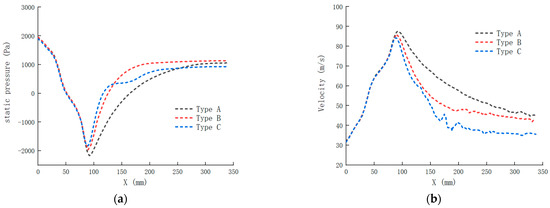 Dynamic pressure field nephogram: (a) type A, (b) type B, and (c) type C.