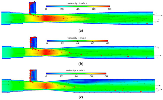 In order to explore the influence of the structural parameters of the diffuser tube on the working performance of the Venturi ejector, the air pressure and velocity characteristics of the three pipes A, B, and C at 1 s and the force and motion characteristics of the seed particles within 0~1 s were compared and analyzed. As shown in Figure 13, Figure 14 and Figure 15. It can be seen from Figure 13 that the airflow pressure and velocity inside the pipeline change significantly. In the contraction section, the static pressure of airflow decreases rapidly and the flow velocity rises rapidly. The static pressure and flow velocity of the airflow at the throat nozzle reach the lowest and highest values, respectively. With the increase in the inner diameter, the static pressure of the airflow gradually increased and the flow velocity gradually decreased, and then both tended to be stable in the mixing section. The distribution of air pressure in the three pipes (Figure 14) shows that the dynamic pressure at the nozzle of the A-type injector is the highest, the air pressure changes in the diffusion section and the mixing section are relatively slow, the pressure distribution is uniform, the area of the high pressure area is the largest and the overall pressure loss is the smallest. The dynamic pressure at the nozzle of the C-type injector is the smallest, the pressure gradient in the diffusion section is the largest and the distribution is uneven, and the pressure loss is the largest. The distribution of air velocity in the three pipes (Figure 15) shows that the air velocity at the nozzle of the A-type injector and the outlet is the highest, the area of the high-speed area is the largest, and the velocity gradient is the smallest; the air velocity at the nozzle of the C-type injector and the outlet is the lowest, and the diffusion of the velocity gradient of the segment is the largest, and local eddy currents appear at the junction of the diffusion segment and the mixing segment, which can easily disturb the movement trajectory of the seed particles, reduce the particle movement speed, and then affect the uniformity and efficiency of the ejector seed supply.
