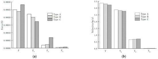 In EDEM software, the average force and speed of the seeds were obtained within 0~3 s, as shown in Figure 16. The seeds are mainly affected by air drag in the X direction, gravity and buoyancy in the Y direction, and the resistance caused by the collision with the pipe wall in the Z direction. The higher the movement speed, the higher the ejector seeding efficiency. It can be seen from Figure 16a that the air drag force on the particles in the A-type ejector is the largest. Under the same conditions of gravity and air buoyancy, the wall resistance is the smallest, which indicates that the number of collisions between the particles and the pipeline is the least, and the particles are evenly distributed; the particles in the C-type injector are subjected to the largest forces in the Y and Z directions, indicating that they have the most collisions with the wall surface. In addition, it also verifies the negative effect of the local eddy current on the population movement trajectory and the uniformity of the injector seed supply in Figure 15c. influences. It can be seen from Figure 16b that the horizontal movement speed of seeds in the A-type injector is the highest, and its seed supply efficiency is the highest. In summary, the A-type Venturi ejector has the smallest pressure loss, the largest outlet airflow velocity, the best seed supply uniformity, and the highest seed supply efficiency.