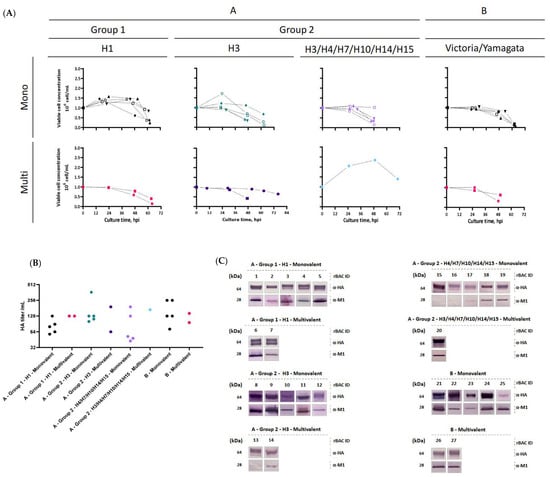 Production of influenza HA-VLPs at the 2 L bioreactor scale. (A) Cell growth kinetics. (B) Extracellular HA titer at time of harvest. (C) Identification of influenza HA and M1 proteins by Western blot. The color code in subfigures A and B corresponds to: black icons—influenza A group 1 H1 monovalent cell growth kinetics; red icons—influenza A group 1 H1 multivalent cell growth kinetics; green icons—influenza A group 2 H3 monovalent cell growth kinetics; purple icons—influenza A group 2 H3 multivalent cell growth kinetics; lilac icons—influenza A group 2 H4/H7/H10/H14/H15 monovalent cell growth kinetics; light blue icons—influenza A group 2 H4/H7/H10/H14/H15 multivalent cell growth kinetics; dark grey icons—influenza B monovalent cell growth kinetics; pink icons—influenza B multivalent cell growth kinetics.
