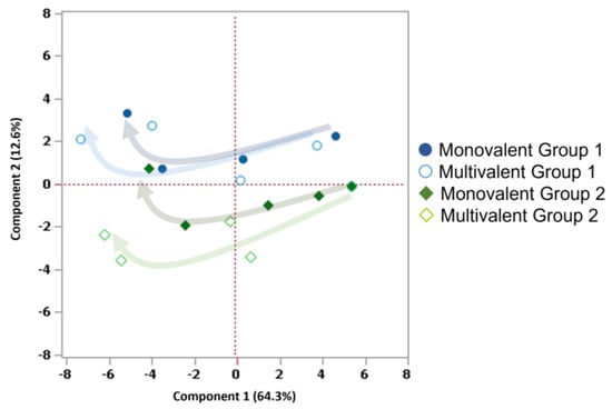 Principal component analysis (PCA) of metabolites and bioprocess-related parameters’ concentrations/values assessed throughout the infection phase for the four HA-VLP production runs at WAVE 20 L bioreactor scale. Color code: Monovalent Group 1 (dark blue), Multivalent Group 1 (light blue), Monovalent Group 2 (dark green), Multivalent Group 2 (light green). Arrows indicate the separation trend over the course of infection.