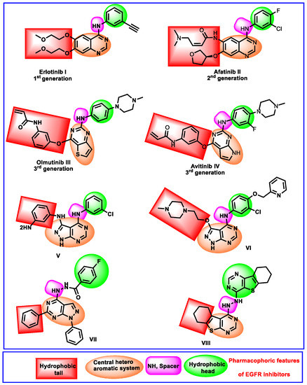 As shown in Figure 1, four essential features should be present in the chemical structure of EGFR inhibitors in order to bond correctly with the active site [38]. These features are a flat hetero aromatic system, an NH spacer, a terminal hydrophobic head, and a hydrophobic tail. These moieties have the potentialities to occupy the adenine-binding pocket, the linker region, the hydrophobic region I, and the hydrophobic region II, respectively of the EGFR active site [39,40,41].