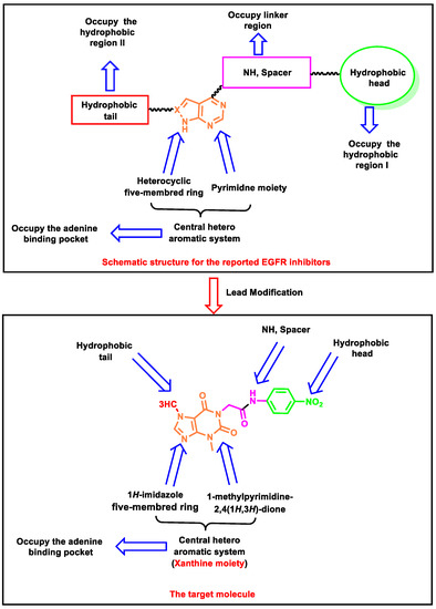 Observing the structures of Olmutinib III, avitinib IV, compounds V, VI, VII, and VIII, there are diverse hetero aromatic systems such as thieno[3,2-d]pyrimidine, 7H-pyrrolo[2,3-d]pyrimidine, and 1H-pyrazolo[3,4-d]pyrimidine. These hetero aromatic systems can occupy the adenine-binding pocket of the EGFR active site. Interestingly, all these aromatic systems are composed of pyrimidine moiety fused with a five-membered ring. Depending on the ligand-based drug design approach, we designed a theobromine derivative that kept the main features of the lead compounds (III–VIII).