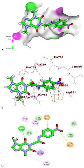 Similar to how erlotinib binds, T-2-PNPA was able to employ its 6-oxo group of the 1H-purine moiety to anchor the adenine pocket via a key HBing formation with Met793. Additionally, in the same pocket, the whole nucleus (3,7-dimethyl-2,6-dioxo-2,3,6,7-tetrahydro-1H-purine moiety) was involved in three hydrophobic bond (HI)s with Leu694 and Cys773. Regarding the hydrophobic pocket, the 4-nitrophenyl moiety was engaged in two pi–pi and two electrostatic interactions with Ala719, Val702, Lys721, and Asp831, respectively. As previously stated, our assumption was that the nitro group would interact with the molecular target via a charge-reinforced HB or electrostatic charge (Figure 4).